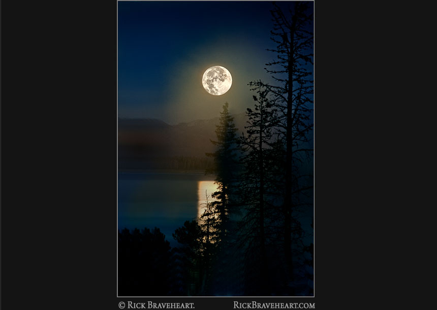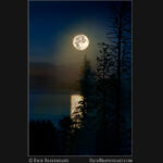 A 45-minute hike in 17° temperatures brought me to this vantage point of Yellowstone Lake to photograph the full moon during the late night sky. With the temperatures at Yellowstone Lake slightly above freezing the resulting fog and water reflection of the rising moon produced beautifully saturated colors and silhouettes of the trees along the shoreline. Photographed in late Fall at Yellowstone National Park, Wyoming [Photo 8609]